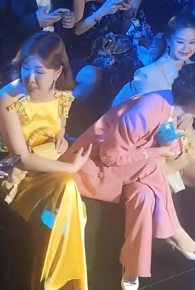 她旁边坐着黄奕,黄奕穿了一件玫粉色西装,黄奕旁边坐着关悦,关悦穿着一件白色西装,两个人都穿的很正式。