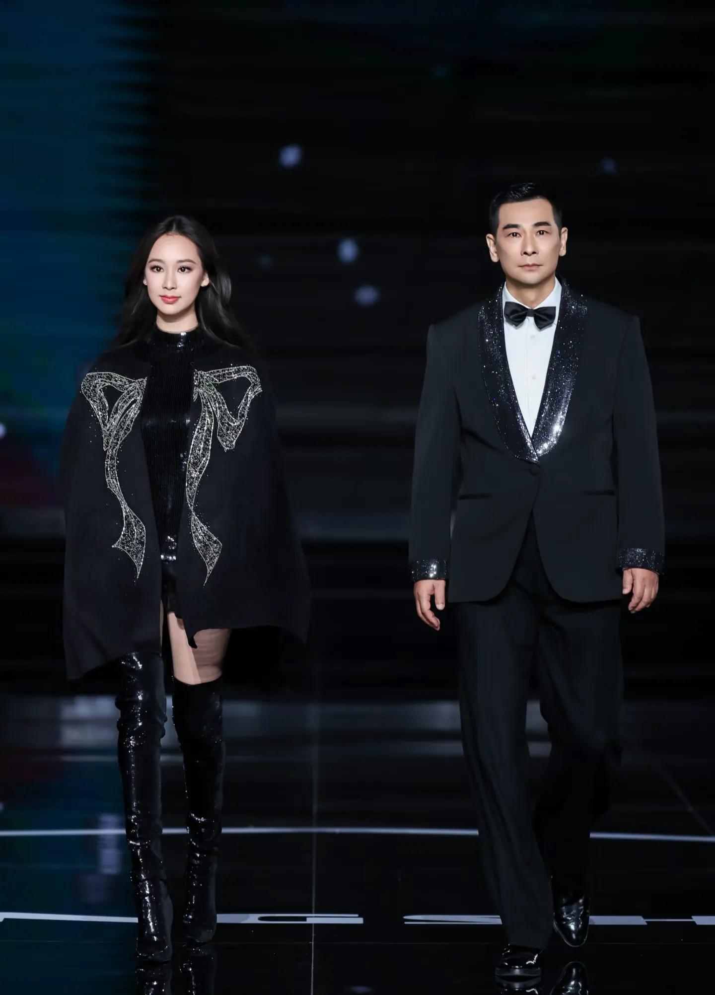 赵文卓带着女儿玫瑰一起走秀,17岁的玫瑰刚刚高中毕业,两个人都是英气十足,一起出场,像走正步一样。